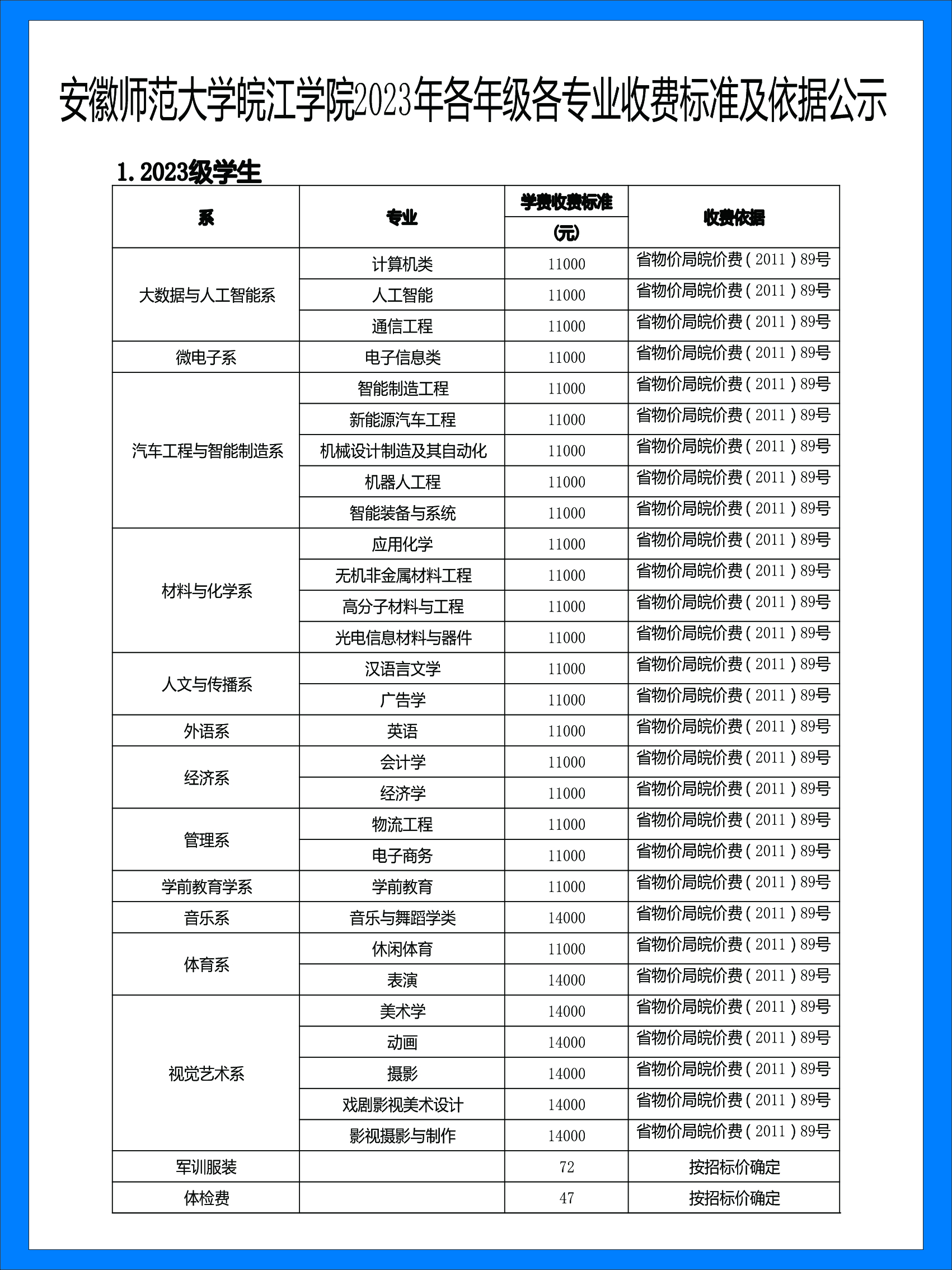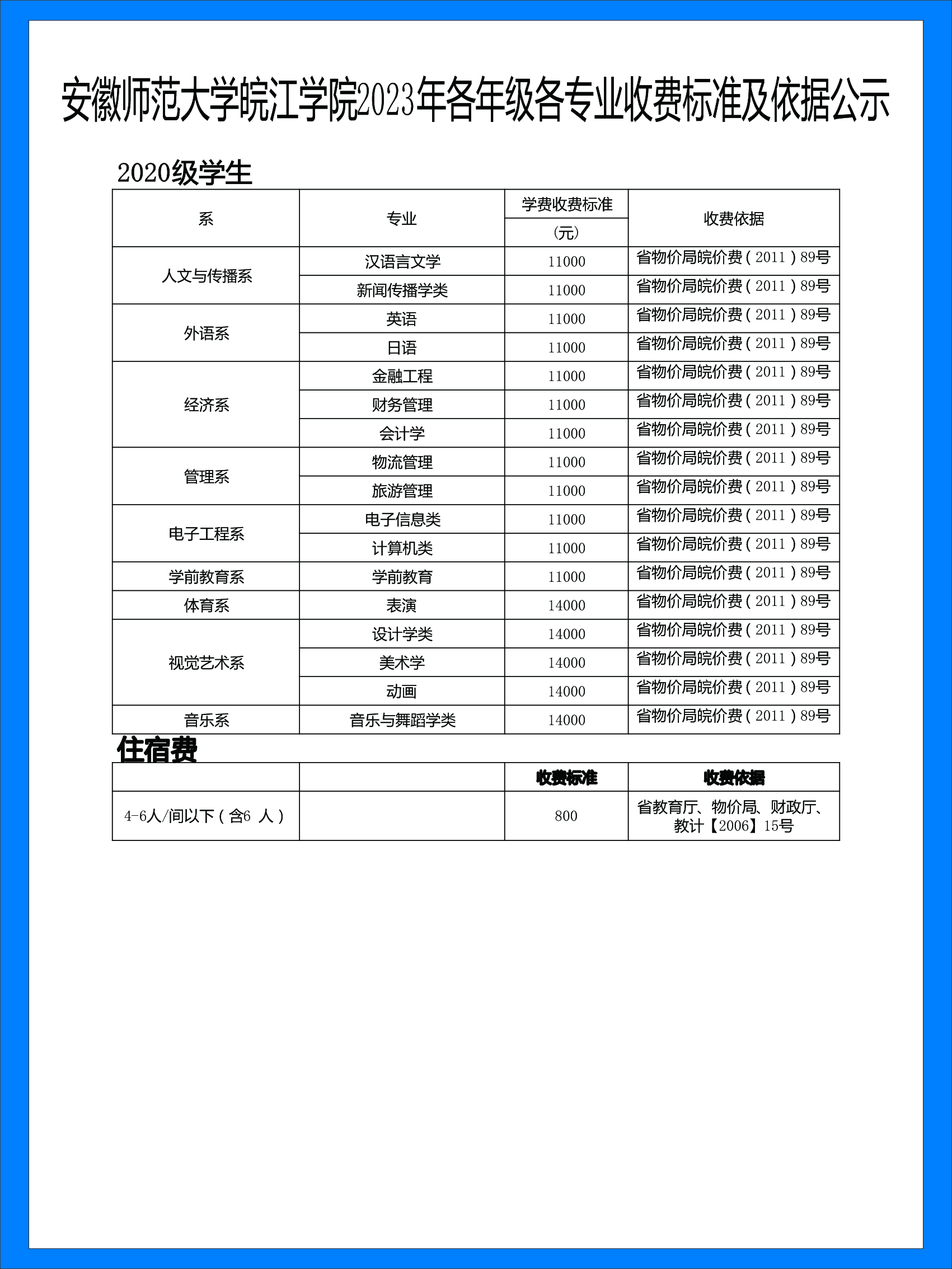 > 安徽师范大学皖江学院2023年各年级各专业收费标准及依据公示