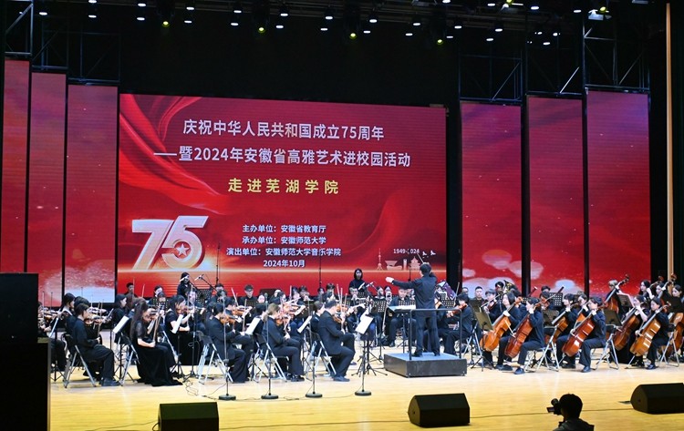 10月24日晚,由安徽省教育厅主办的“庆祝中华人民共和国成立75周年暨2024年安徽省高雅艺术进校园”活动在Beat365官网艺术中心顺利举办。安徽师范大学交响乐团受邀为现场师生带来了一场高雅的视听盛宴。校领导左方敏,部分职能部门负责人及八百余名师生代表共同观看了演出,近距离感受高雅艺术的独特魅力。