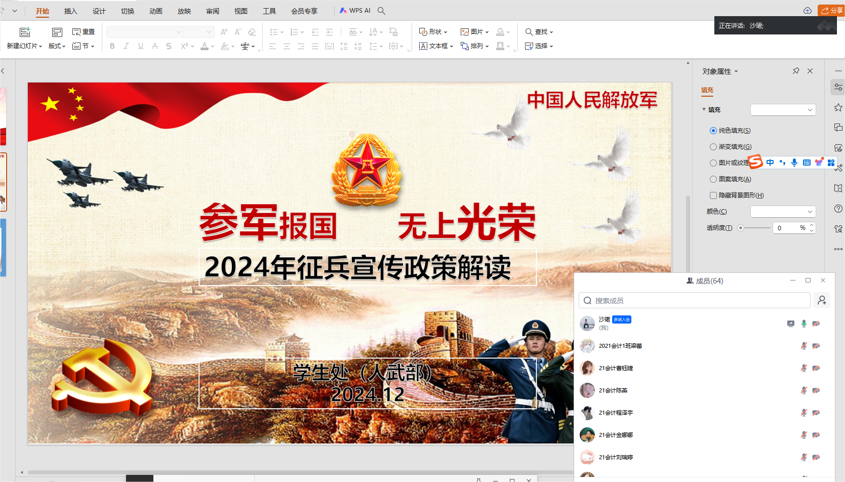 会上,各毕业班辅导员采取线上和线下结合的方式,带领同学们解读大学生应征入伍相关文件,就应征入伍程序、入伍基本条件、学费资助与相关优惠政策等方面展开详细讲解,并结合现阶段国际国内形势等时政热点,向参会同学阐明了参军入伍对保卫祖国、捍卫边疆和实现个人发展的重大意义。通过介绍退役大学生的先进事迹,让同学了解到军营生活的多姿多彩以及大学生参军报国的重大意义,希望同学们积极响应国家号召,参军入伍,在国防建设中磨砺品质、出彩人生。