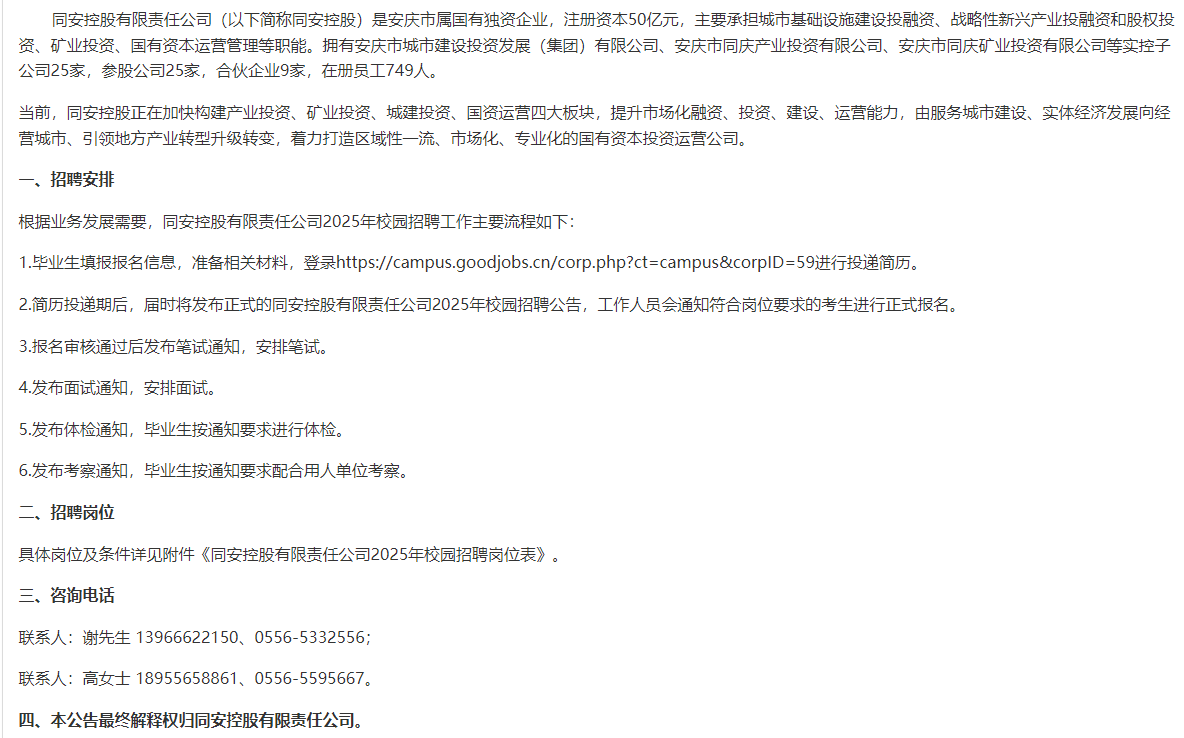 同安控股有限责任公司2025年校园招聘