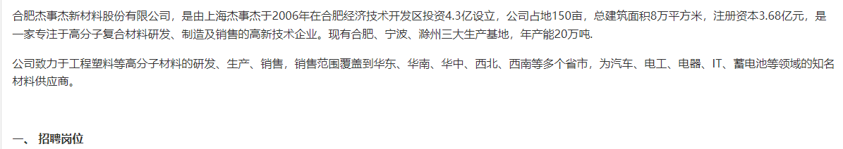 > 合肥杰事杰新材料股份有限公司招聘简章