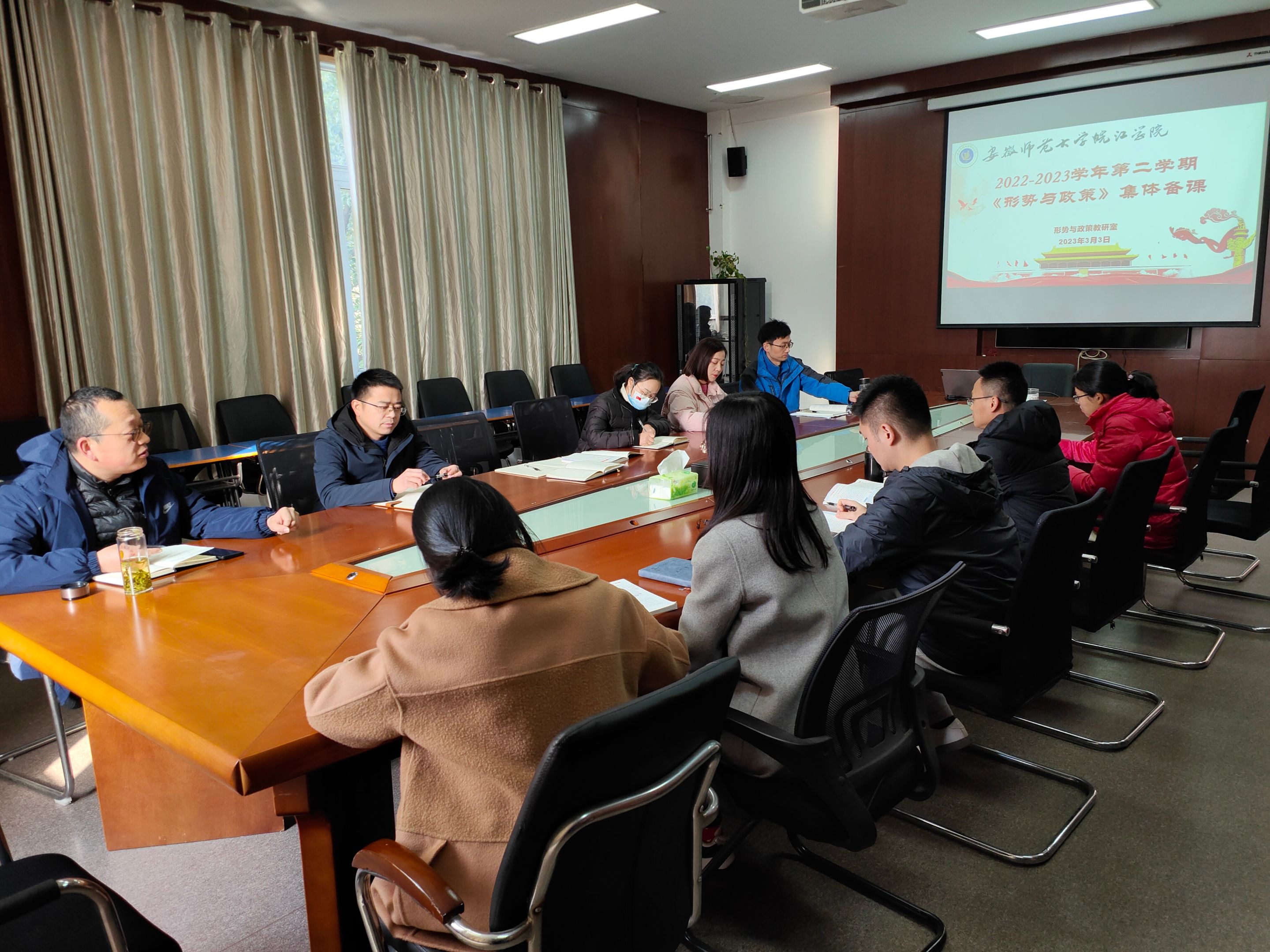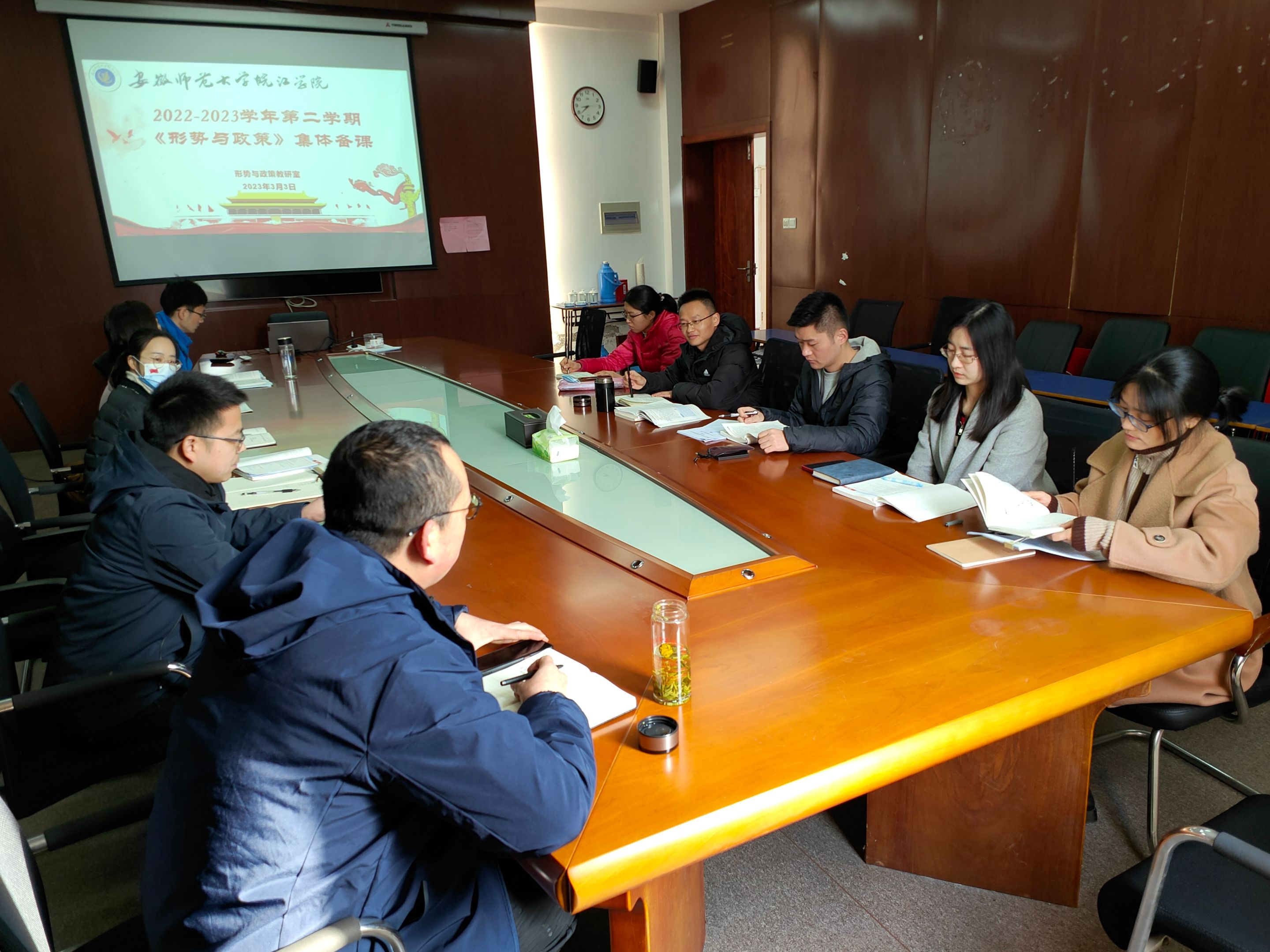 为深入贯彻落实党的二十大精神进课堂,进一步提高“形势与政策”课教学质量,思政教研部“形势与政策”教研室于2023年3月3日上午8点30分在文津校区西一201会议室召开2023年春季学期集体备课会。形势与政策教研室全体授课教师参加会议,会议由教研室主任方宝华主持。