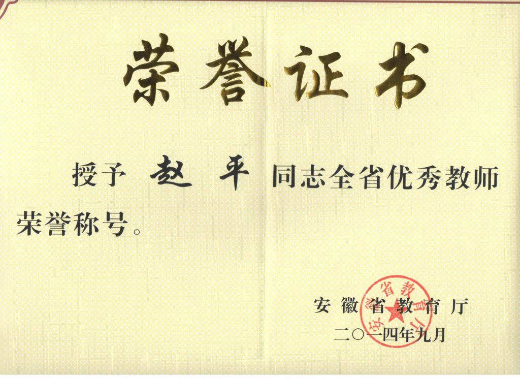 2014年9月,我部教师赵平教授荣获:“安徽省优秀教师”称号。