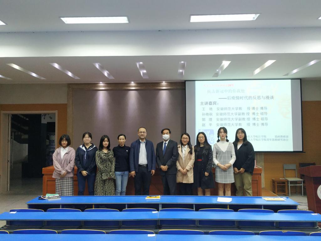 10月14日下午,由思想政治理论教研部和青年思想研究协会联合举办的人文之光论坛之系列讲座第二十八期“抗击新冠中的你我他——后疫情时代的反思和漫谈”于皖江校区图书馆学术报告厅举行。安徽师范大学王艳教授、赵平教授、郭理副教授和孙艳秋副教授四位专家应邀出席。院近300余名皖江学子共同聆听讲座。