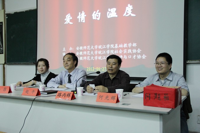 本网讯 4月27日晚,由院基础教学部主办的“人文之光”思想文化活动之师生对话系列之三爱情篇——“爱情的温度”在图书馆报告厅举行。学院基础教学部主任赵平,安徽师范大学政法学院副教授、博士路丙辉,安徽师范大学政法学院副教授、南京大学哲学博士牛菲以及南京大学哲学博士、院基础部讲师何光辉等作为特邀嘉宾出席师生交流会。