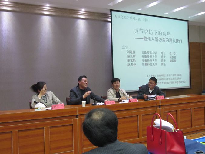 本网讯 4月15日晚,由思想政治理论教研部、党委宣传部和青年思想研究协会联合举办的“人文之光”之徽文化对话系列活动在图书馆报告厅举行,首场对话活动以“贞节牌坊下的哀鸣——徽州人婚恋观的现代拷问”为主题。安徽师范大学历史与社会学院教授刘道胜、与传播学院副教授秦宗财、博士赵忠仲和图书馆博士董家魁做客“人文之光”与皖江学子一起走进历史上的徽州,感受徽州深厚的人文底蕴。活动由思政部主任赵平教授主持。