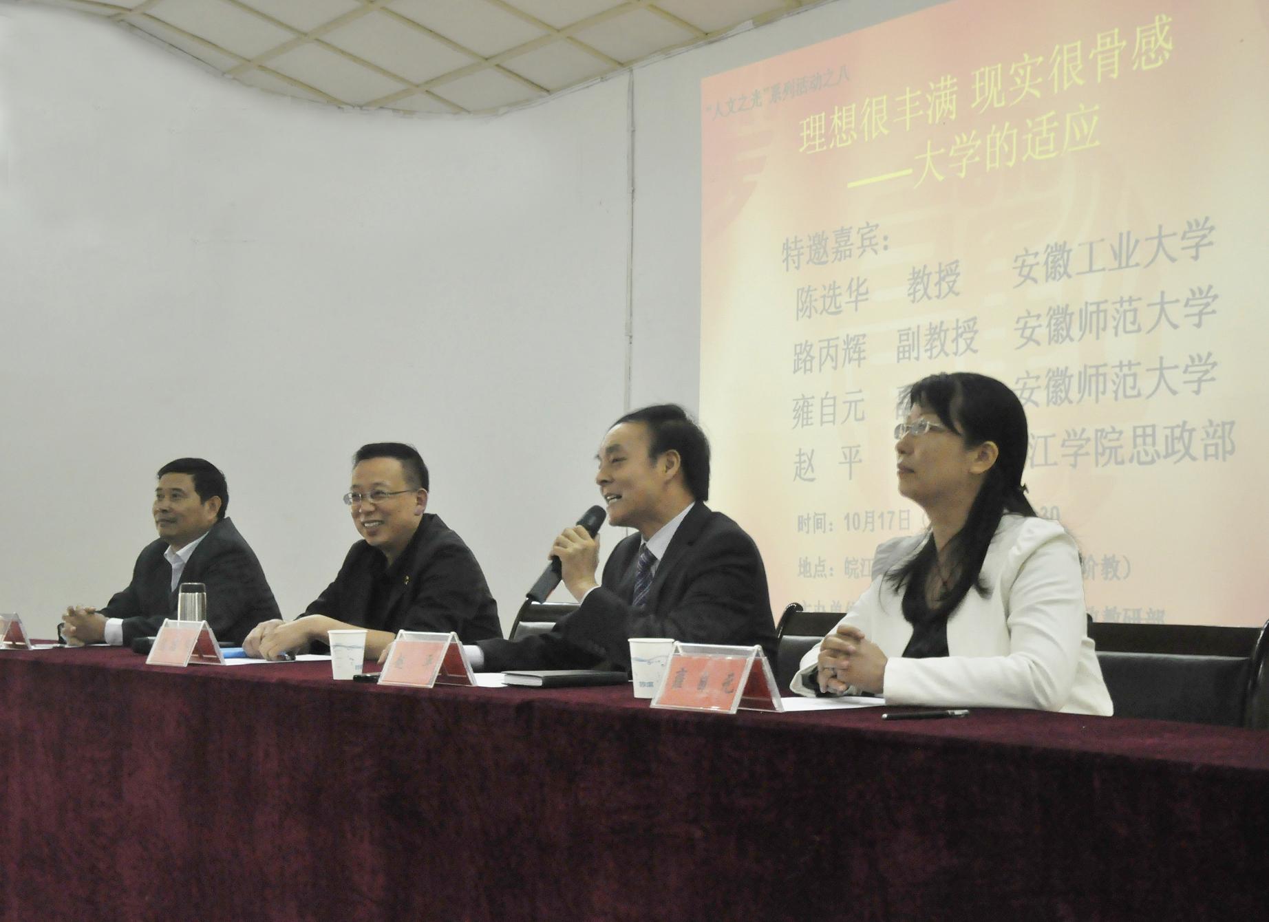 本网讯 10月17日,安徽工业大学马克思主义学院院长、党委书记、教授陈选华,安徽师范大学副教授路丙辉、雍自元应邀参加思政部举办的“人文之光”校园文化活动第八讲 “理想很丰满 现实很骨感——大学的适应”。活动由思政部主任赵平主持。