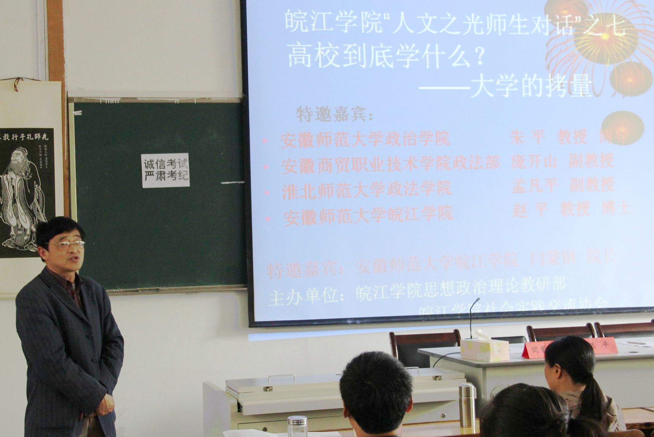 本网讯 4月25日下午,“人文之光”师生对话系列第七讲“高校到底学什么”在图书馆报告厅举行。院党委书记、院长闫蒙钢、安徽师范大学政治学院教授朱平、安徽商贸职业技术学院政法部副教授庞开山、淮北师范大学政法学院副教授孟凡平应邀主讲。院思政教研部主任赵平和部分教师参加讲座。近300名皖江学子聆听讲座。