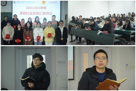本网讯 3月3日下午,学院2022-2023学年“学习二十大、永远跟党走、奋进新征程”寒假社会实践汇报评比在西三教学楼302教室举行。就业指导中心副主任章敬峰、院团委社团部部长俞珍珍、教务处教师高昊辰应邀担任评委。