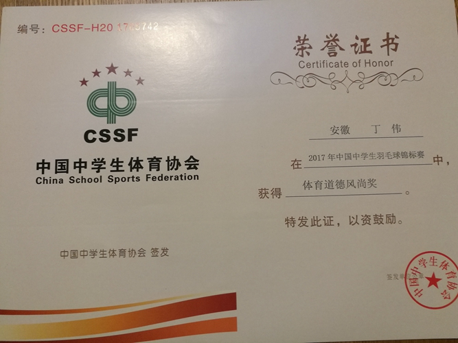 由安徽凤阳中学承办,2017年中国中学生羽毛球锦标赛于8月7日至13日在安徽凤阳开赛,来自全国各地的60余支代表队和近500名运动员参加本次比赛。丁伟老师受安徽省羽毛球协会选派,担任本次比赛裁判工作。经大赛组委会根据裁判员的工作实绩和专业水平进行评选,共有8名裁判员被中国中学生体育协会授予“优秀裁判员”殊誉。