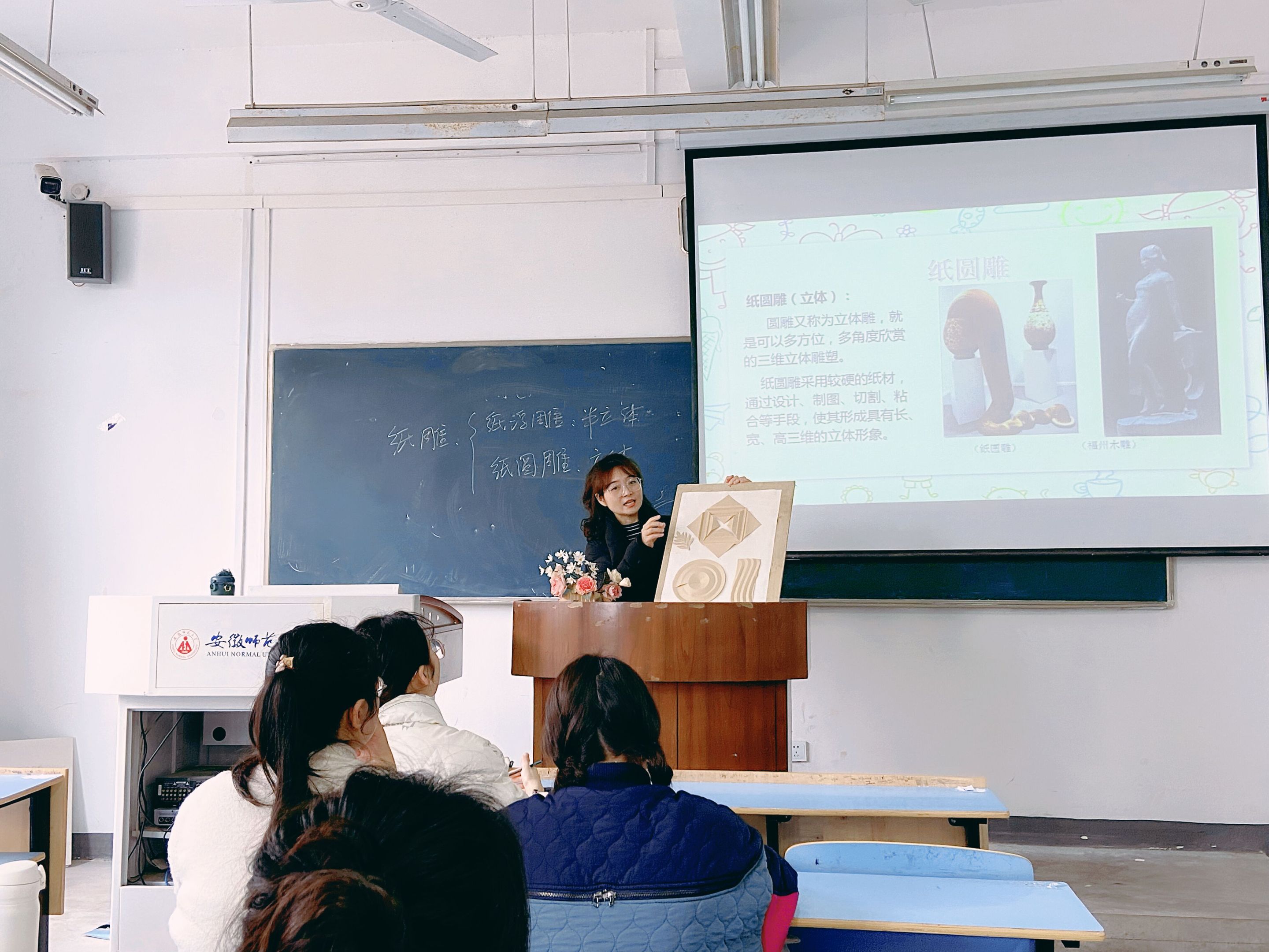 2023年3月23日上午,由学前教育系青年教师郑芸主讲的课堂教学公开课《幼儿园实用美术》在文津校区西三307教室开讲。本次公开课授课内容为纸雕制作,授课对象为2021级学前教育专业学生,全系无教学任务的青年教师参与观摩学习。