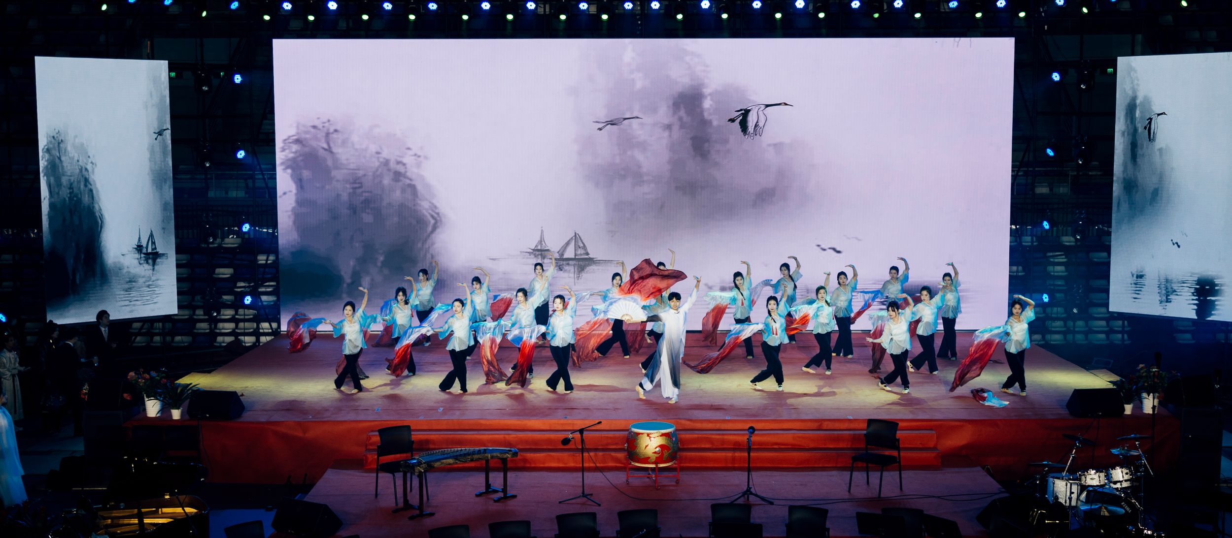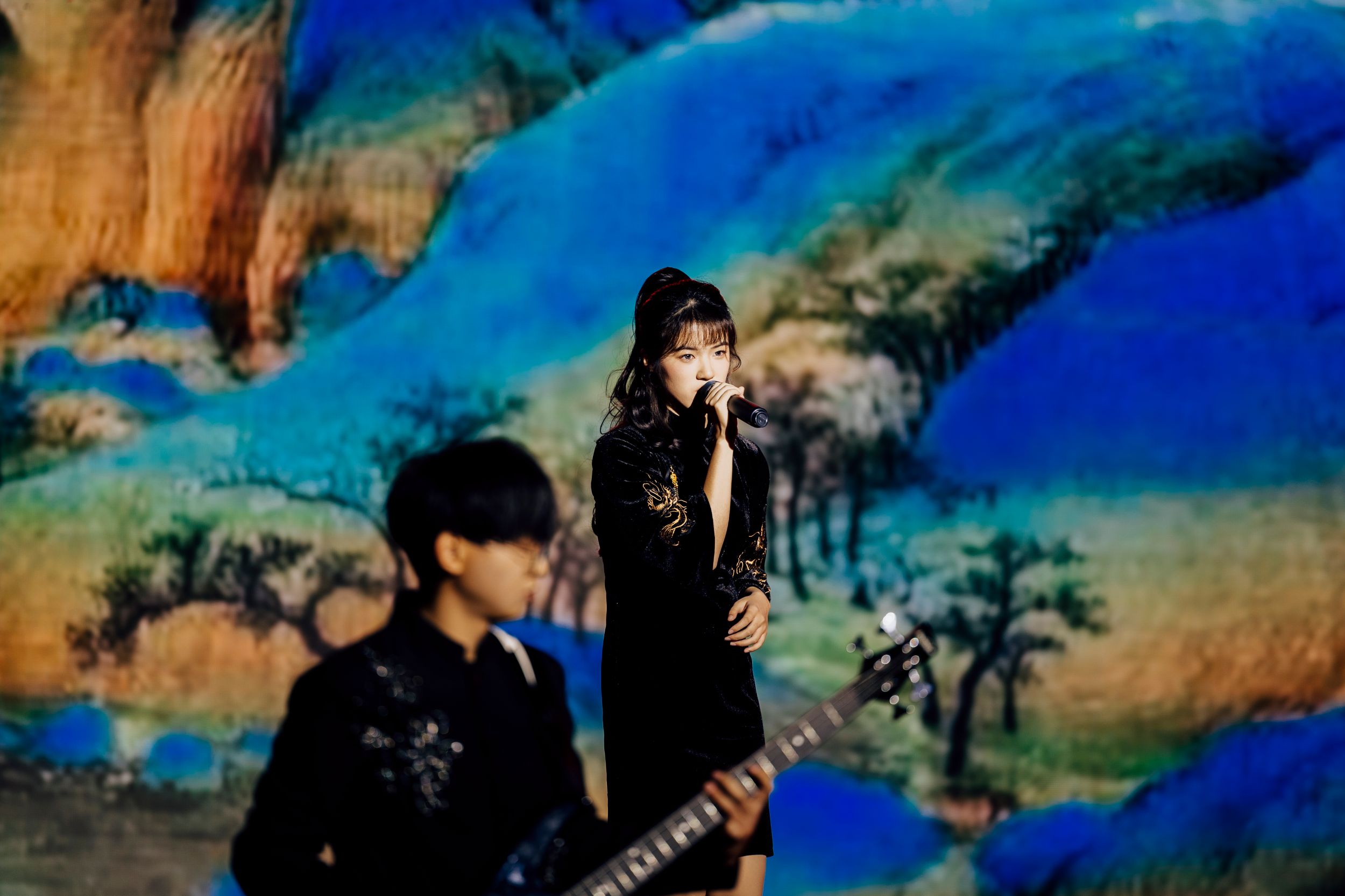 少年有意气,少年有志气。以青春为主题的第二篇章在歌曲串烧《山河图》《龙的传人》《灯火里的中国》《奢香夫人》《我的中国心》中展开。师生同台,唱出家国情怀,将全场气氛推向高潮。其中《奢香夫人》更是引发现场观众合唱。音乐系、大学生艺术团舞蹈团以及汉服社共同呈现的民乐表演《国潮音画》美轮美奂。笛音悠扬,鼓乐合鸣,或深沉雄厚,或宛转悠扬,身着汉服的学子从乐声中缓缓走来,一举一动显东方之美,传大国风貌。“枝头桃花红,陌上杨柳绿”,而由音乐系、学前教育系以及大学生艺术团舞蹈团带来的另一重唱节目《春风十万里》则是唱出了春的美妙,一元复始,万象更新。