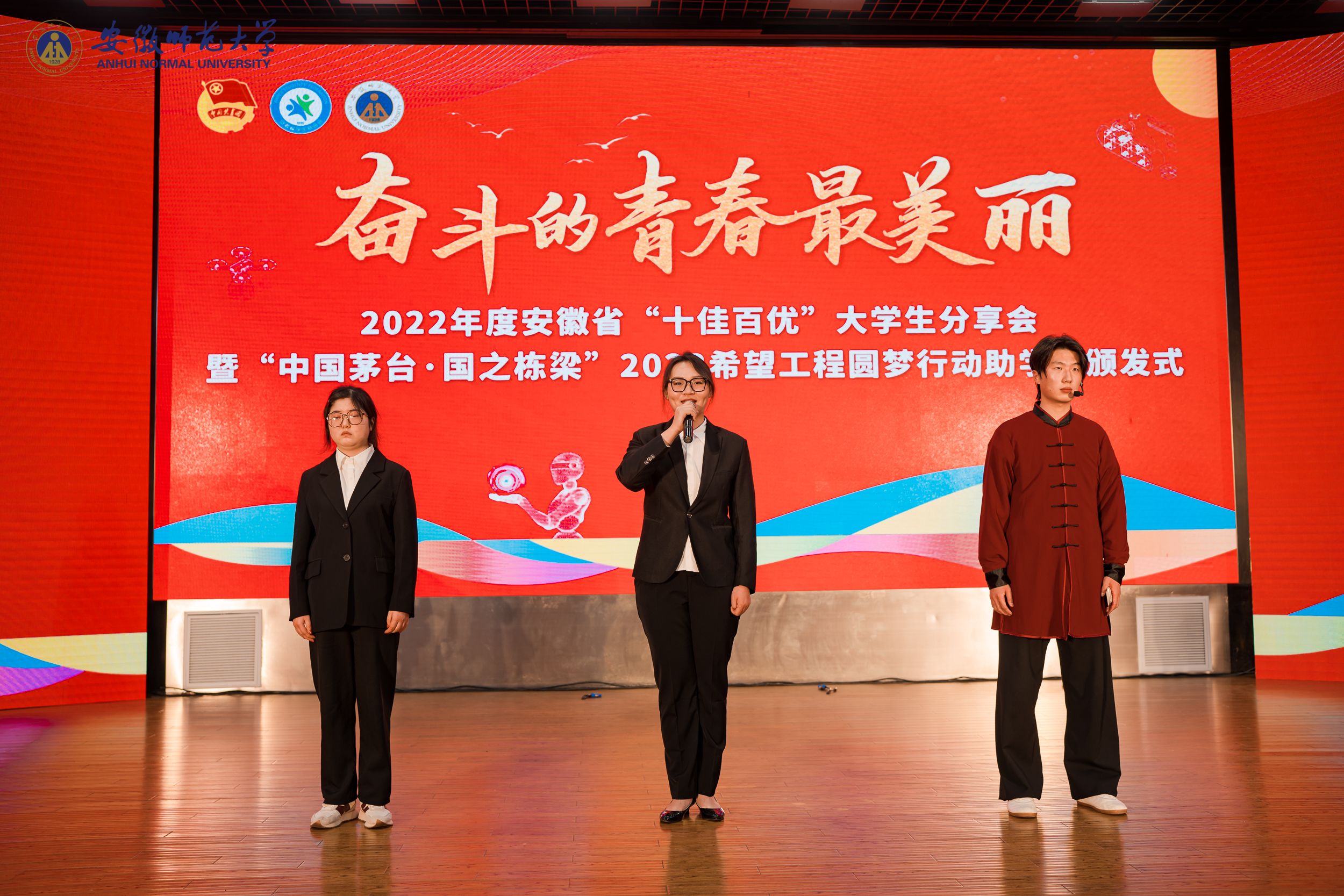 为表彰先进、树立典型,激励全省在校大学生群体踔厉奋发、创先争优,12月6日下午,由团省委、省委宣传部、省文明办、省教育厅、省经信厅、省生态环境厅、省文化和旅游厅、省体育局、省科协、省残联、省学联、省青少年发展基金会联合评选的2022年安徽省“‘十佳’‘百优’大学生”颁奖仪式在安徽师范大学顺利举行。其中,我院学子金淋获评安徽省“‘十佳’大学生”荣誉称号并发表青春感言。