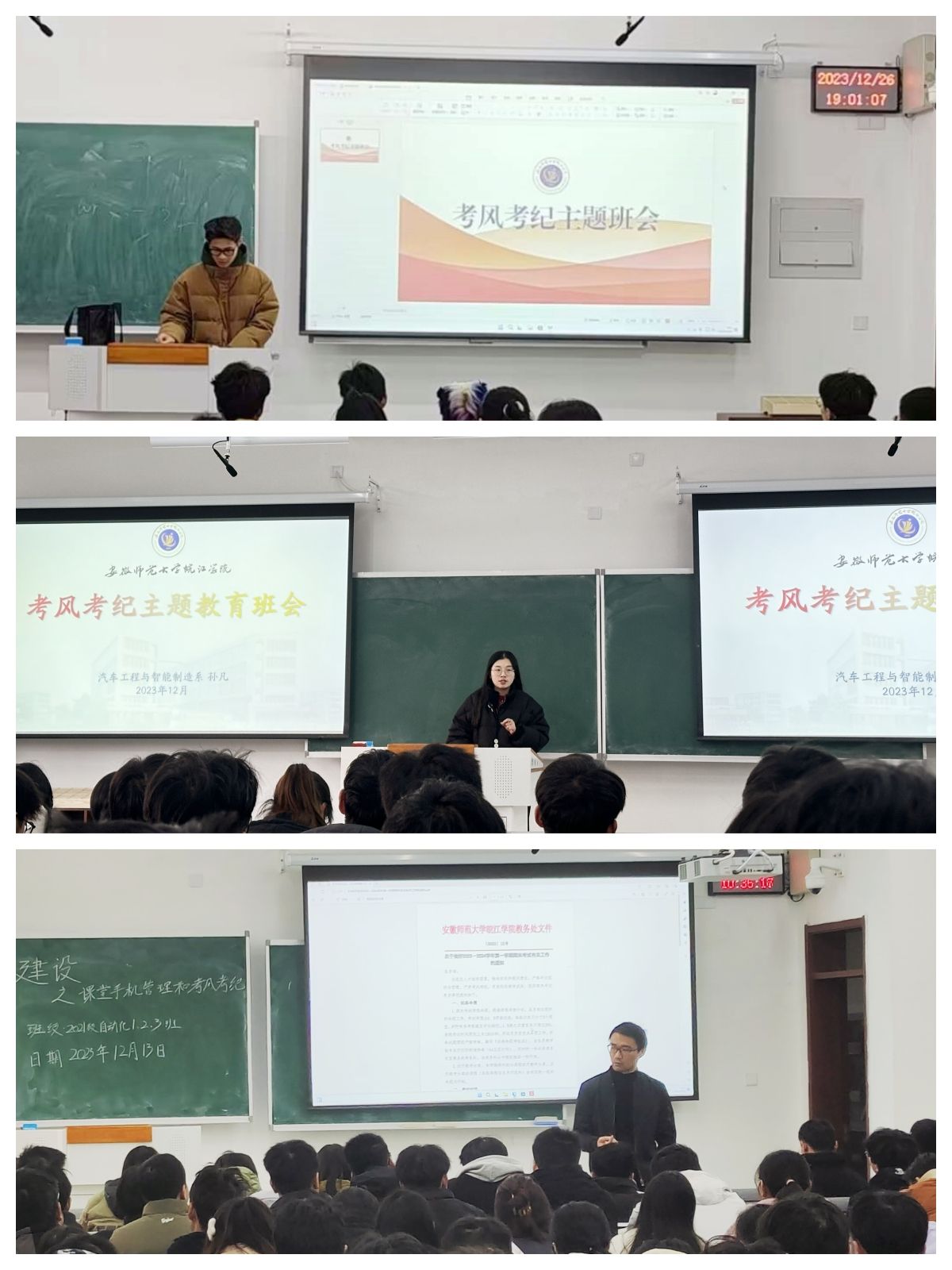为进一步加强考风考纪教育,持续强化学风建设,倡导同学们树立诚信为本、公平竞争的思想理念,做到诚信考试、拒绝作弊,汽车工程与智能制造系以班级为单位召开了考风考纪教育主题班会,班会由各班辅导员老师主持。